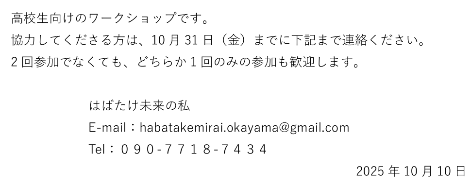 協力してくださる方は、8月10日(土)までに下記まで連絡ください。往復交通費と少しのお礼をお支払いします。2回参加でなくても、どちらか1回のみの参加も歓迎します。