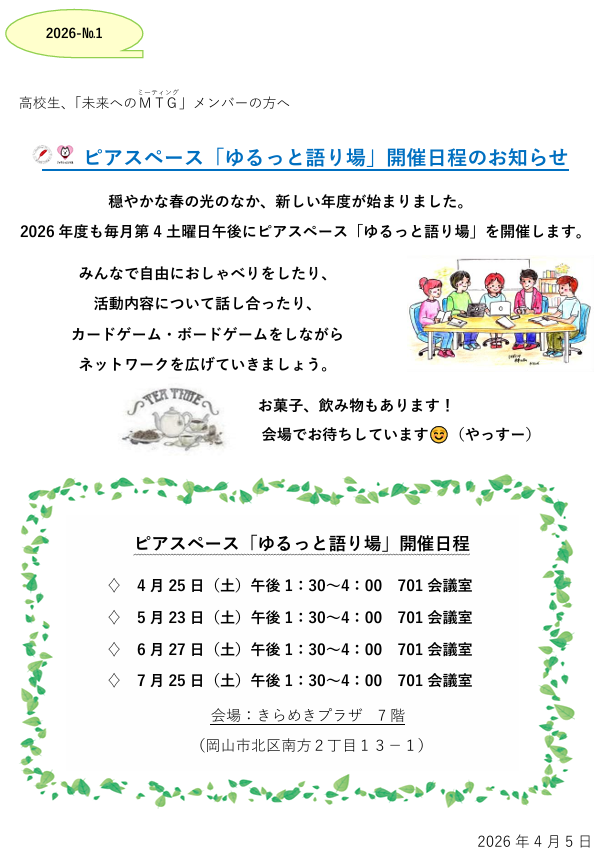 「ピアスペース(仲間が集う空間)」始まります! 春の陽気に包まれ、新年度がスタートしました! 「未来へのMTG」はこれからも高校生一人ひとりや仲間に寄り添い、安心と笑顔を届けるように努めて参ります!今年度は新たな取り組みとしてピアスペースを始めました!みんなと話したい!ゆっくりしたい!遊びたい!など自由な空間で楽しんでみませんか? 第1回は、4月26日(土)です。 今年度もどうぞよろしくお願いいたします。